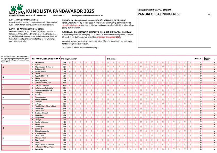 Vad kul att du vill sälja pandasaker! För att börja sälja behöver du det säljmaterial som du har fått i brevlådan. Om du inte fått något eller behöver komplettera det material du fått kan du beställa hem det nedan!